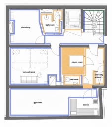 On the first floor: a dormitory with two bunk beds (sleeps three), a cinema room and the spa area with hammam, sauna, yoga room, shower and WC.